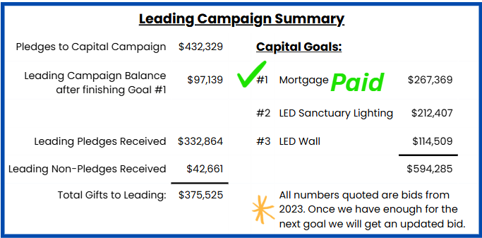 Replace Stage Lights in Sanctuary = $89,000*